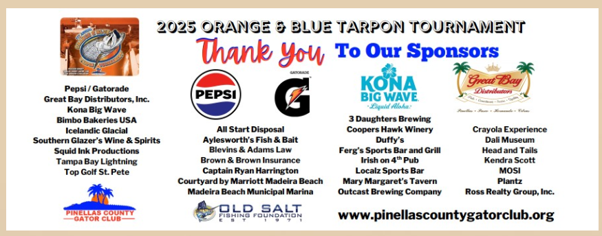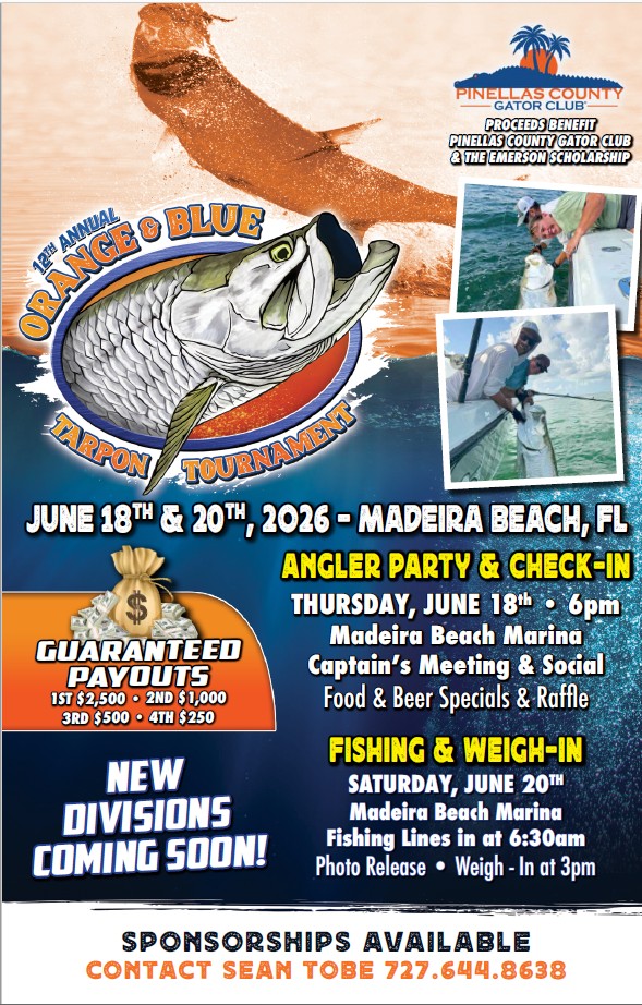 We are excited to announce the return of our signature fundraising event, the 12th Annual Orange and Blue Tarpon Fishing Tournament. All proceeds from the tournament go directly to our Emerson Scholarship Fund to benefit incoming Gator freshmen from Pinellas County. We are now accepting sponsors for 2026! Contact Sean Tobe if interested.